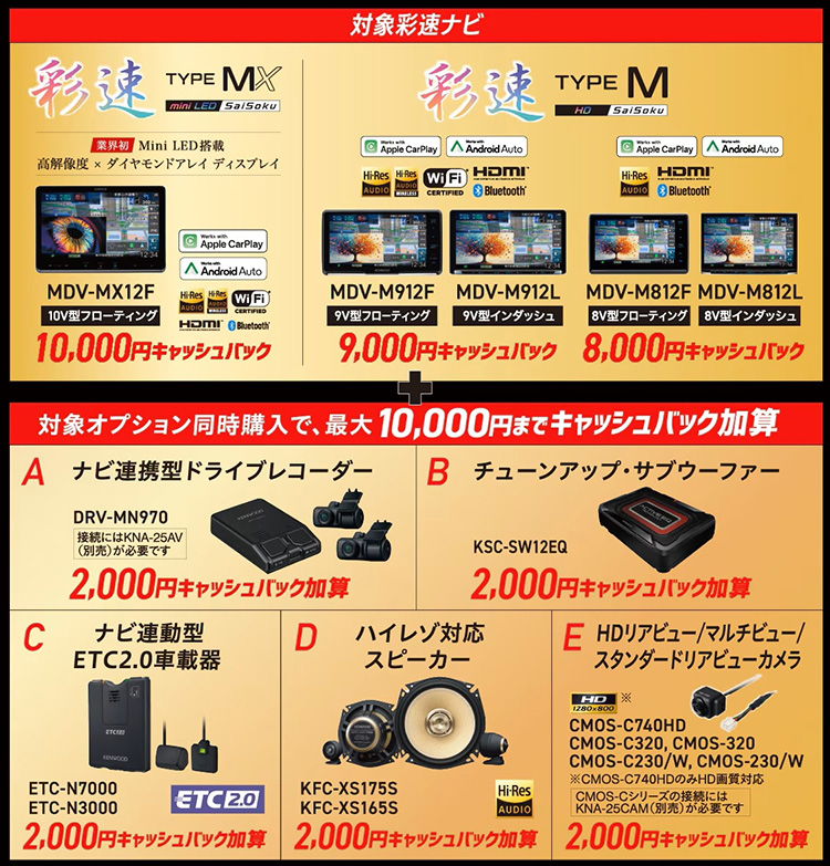 • MDV-MX12F+DRV-MN970+KSC-SW12EQ+ETC-N7000+KFC-XS175S+CMOS-C740HD購入で20,000円キャッシュバック