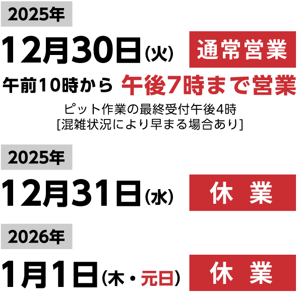 2025年は12月30日(火)午後7時まで営業、ピット作業の最終受付は午後4時ですが混雑状況により早まる場合があります。2025年12月31日(水)と2026年1月1日(木・元日)は休業します。2026年は1月2日(金)午前10時から通常営業となります。年末年始は大変混雑します、早めのご来店をおすすめします。