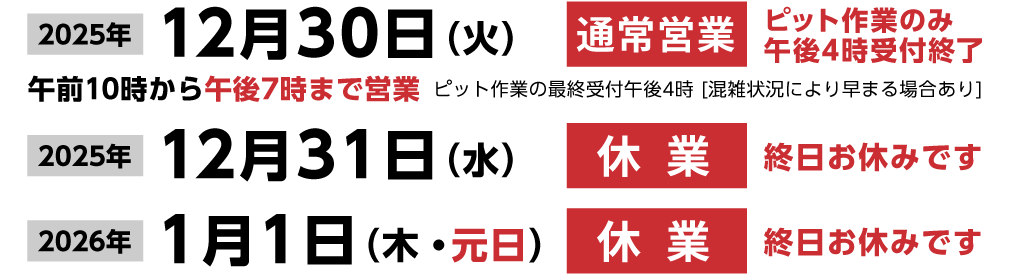 2025年は12月30日(火)午後7時まで営業、ピット作業の最終受付は午後4時ですが混雑状況により早まる場合があります。2025年12月31日(水)と2026年1月1日(木・元日)は休業します。2026年は1月2日(金)午前10時から通常営業となります。年末年始は大変混雑します、早めのご来店をおすすめします。