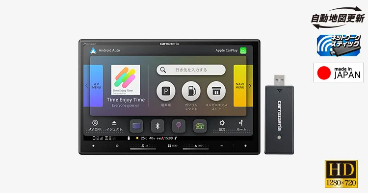 楽ナビ2025年モデルは「車内Wi-Fiスポット」機能を搭載。同梱もしくは別売のネットワークスティックを接続すれば通信量を気にせずスマートフォンやタブレットなどでオンラインの動画や音楽・ゲームなどを楽しめるだけでなく、スマートフォンなどをミラーリング接続することでHD画質の高精細な映像コンテンツを大画面で視聴することも可能です。